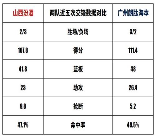山西汾酒与广州朗肽海本历史上一共交手44次,山西汾酒23胜21负。上赛季两队交手2次,山西汾酒2胜0负。