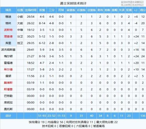 梅尔顿24分6板3助、格林20分3板6助、波杰姆斯基16分6板7助2断、库里14分3板5助、希尔德14分3板1助2断3帽、穆迪12分1板2助、理查德11分6板5助3断、霍福德11分2板1助